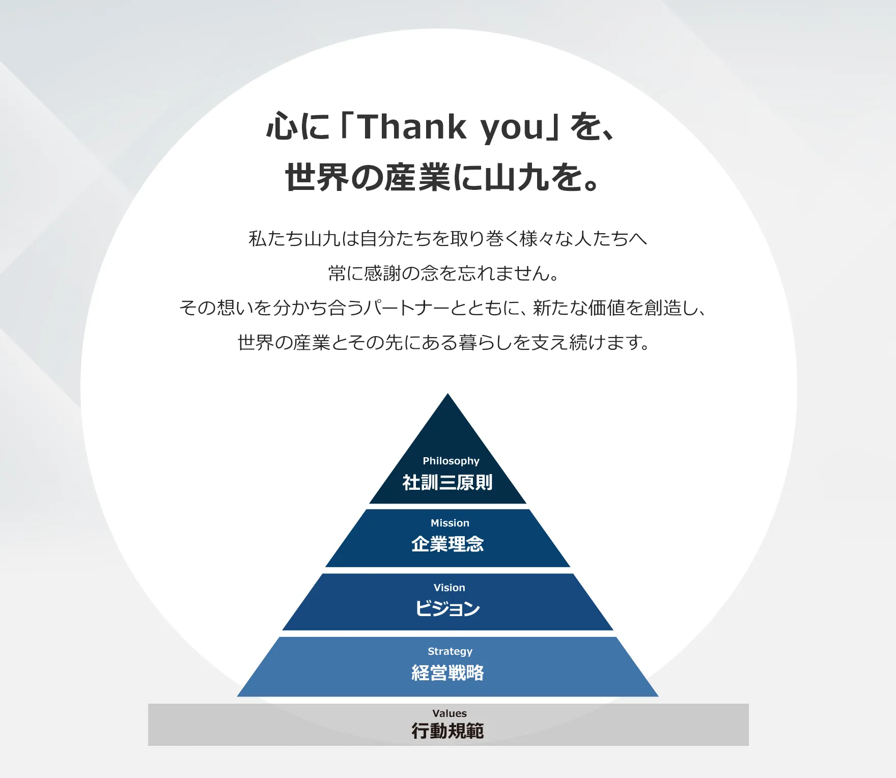 人を大切にすることを基本理念とし、お客様にとってなくてはならない存在としての山九を築きます。そして、社業の発展を通じて社員の福祉向上並びに社会の発展に貢献します。